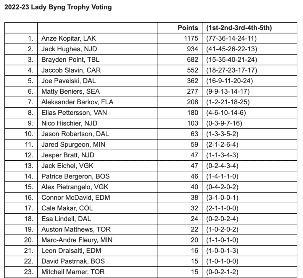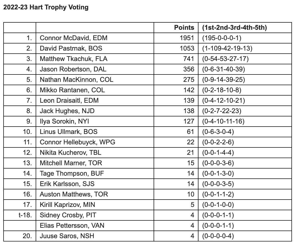 195 of 196 voters had McDavid first on their ballot, while one writer had him in fifth place on their ballot. Pettersson picked up one fourth-place vote and one fifth-place vote for the Hart. This landed him in a tie with Sidney Crosby for 18th place. Here is the full voting breakdown: