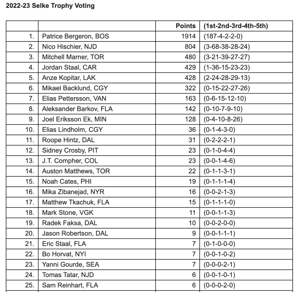 Former Canuck Bo Horvat picked up three votes, and JT Miller picked up one fifth-place vote for the Selke.