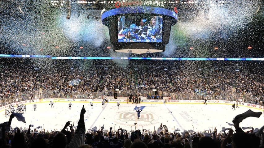 Rogers Arena Celebrates Kevin Bieksa’s WCF series winner with controversial confetti.