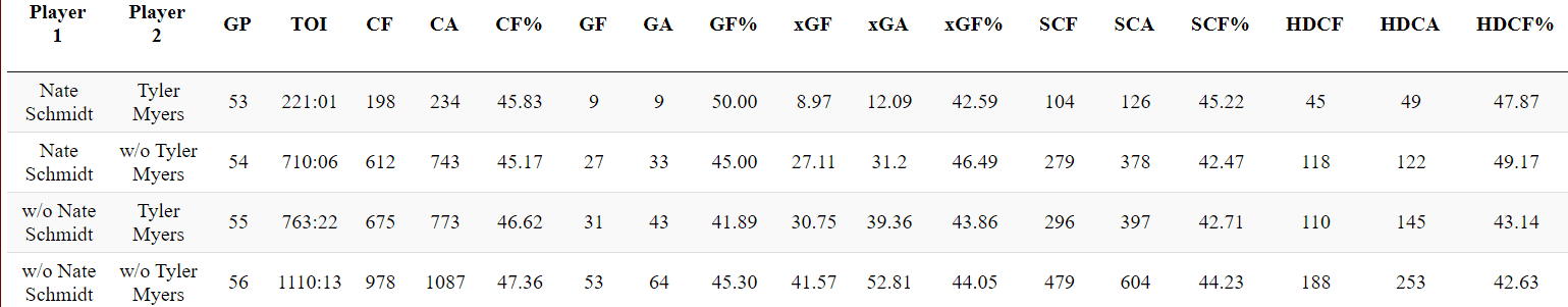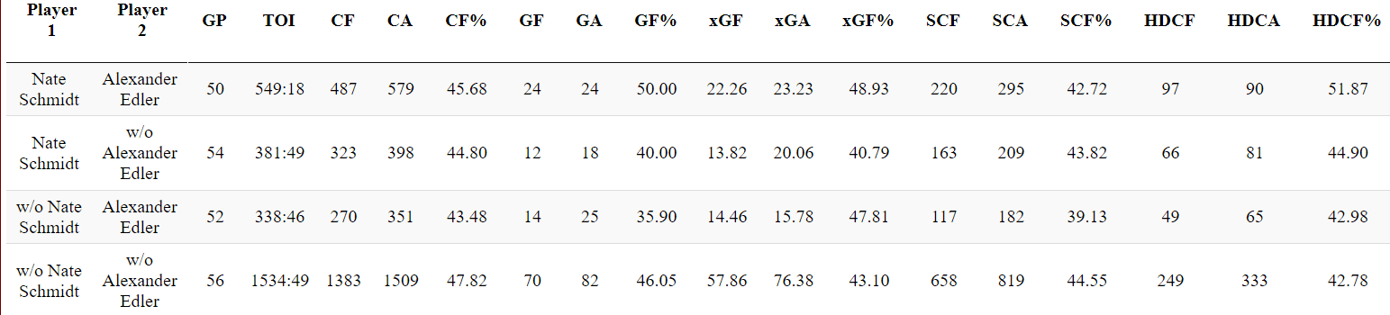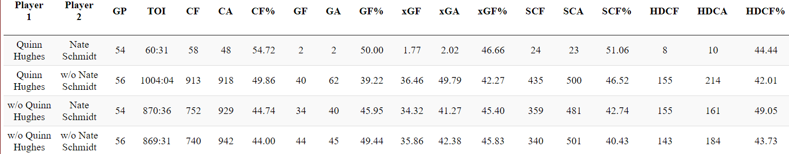 In fact, Hughes’ expected goals rate and share of high-danger scoring chances were lower than the team average when he was on the ice without Schmidt, but well over and above when Schmidt was on his right.