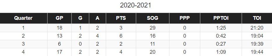 In terms of quarterly results, Schmidt was relatively consistent, though it is curious that his best results by far came during the season’s second quarter, during which Schmidt received his least ice-time of the season.