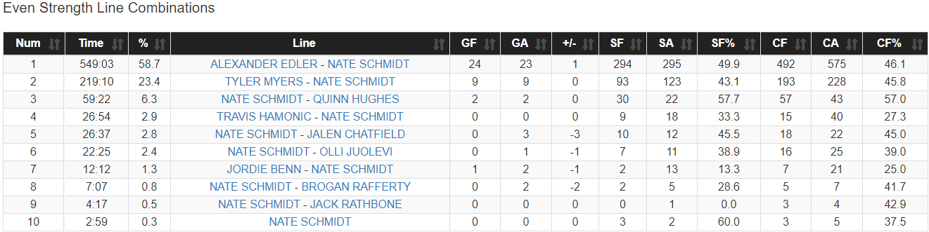 Speaking of Edler, that’s who Schmidt spent the vast majority of the 2021 season alongside, with nearly 60% of his even-strength shifts occurring on Edler’s right side.