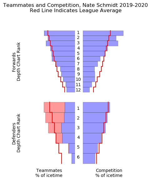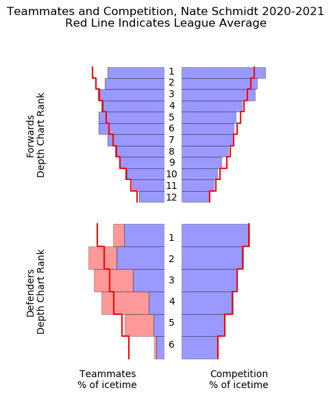 If there’s one singular item that demonstrates how much Schmidt’s play regressed in Vancouver beyond his change in situation, it’s his quality of competition. Just take a look at his 2021 deployment next to how the Knights used him in 2019/20.