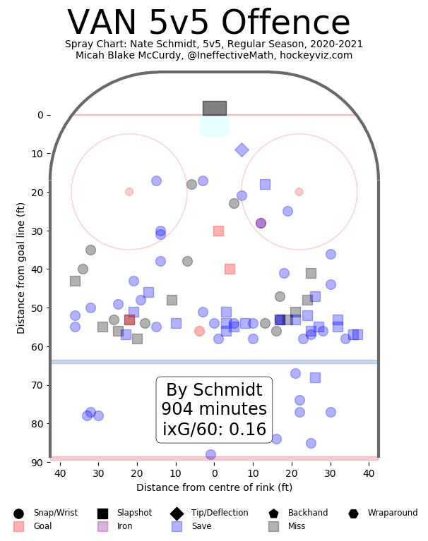 Somewhat surprisingly, Schmidt wasn’t a go-to penalty killer in Vegas, nor was he in Vancouver. He did kill penalties regularly, but only achieved moderate results on a team that ranked in the middle of the shorthanded pack overall – results made even less impressive by the fact that Schmidt played most of his PK shifts against second power play units.