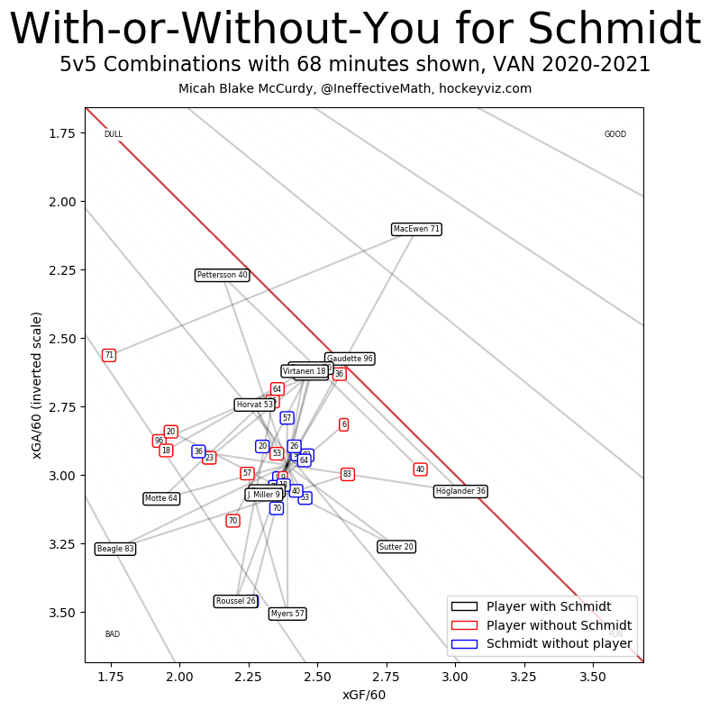If anything, most players seemed to enjoy a slight uptick in their expected goals rate while Schmidt was on the ice, underlying evidence of his puck-moving prowess despite a lack of finish on either his part or theirs.