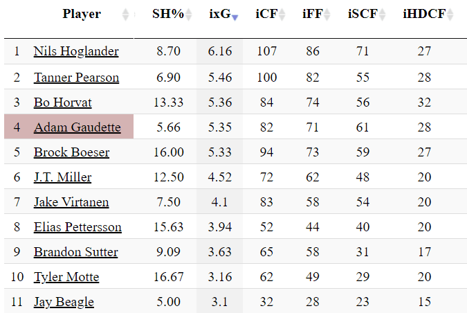 Here, Gaudette ranked fourth on the Canucks, behind just Nils Höglander, Tanner Pearson, and Bo Horvat.