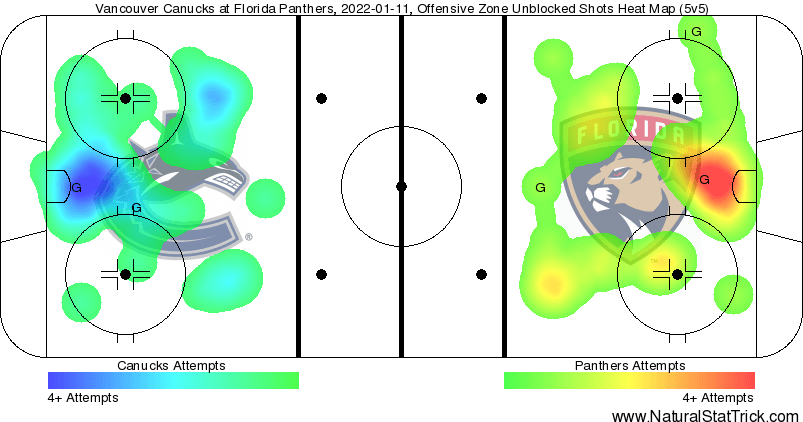 First, the good news. The Canucks actually outshot the Panthers 11-7 in the first 20 minutes, which seems impossible given which team was in the driver’s seat. But the Canucks also showed a significant change in their mentality from previous rough starts — the resiliency to keep pushing. And it paid off in the form of Dickinson’s tally and a one-goal game heading into the second.
