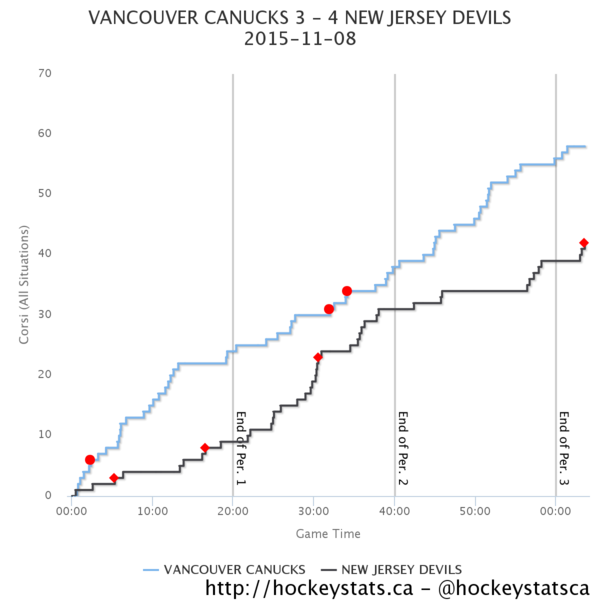 Not a terrible outing in regards to momentum. At no point were the Canucks outshot by the Devils and at times, they really separated themselves from them. Alas, Kinkaid had a very solid game and Miller, well, he was due for a not-so-stellar one.