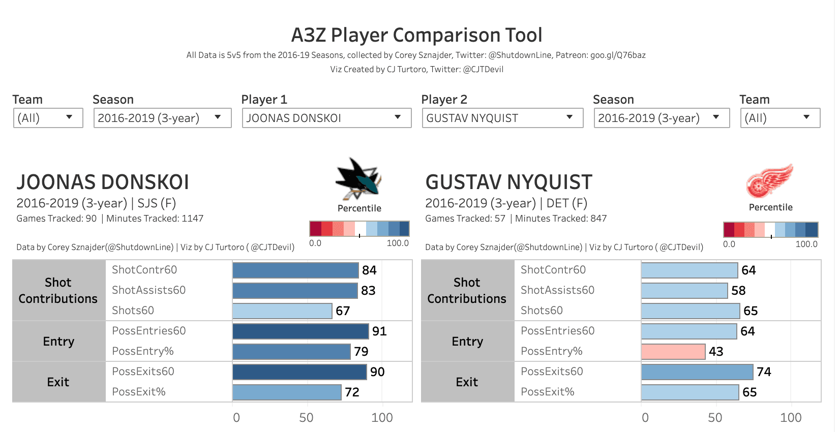 When you compare Donskoi to his San Jose teammate Nyquist with some advanced stats, Donskoi holds an edge in many categories, including zone entries and exits. He might not supply the same amount of offensive production as Nyquist, but when you take into consideration age, term and the potential cap hit, Donskoi would likely provide you with better value.