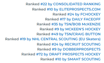 Steven Ellis, Daily Faceoff: “I didn’t love his game in the first half, but his late-season play really grew on me, especially during the MHL playoffs. Against his own age group, he can carry the load on the blueline and can be physically intimidating. Scouts are all over the place with him, but I like his potential.”