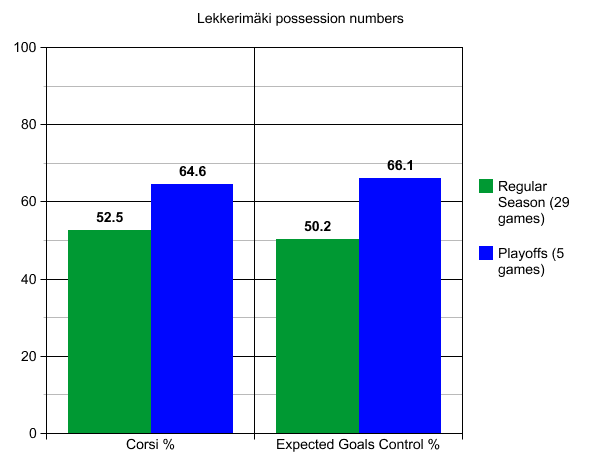 These are significant boosts to his possession numbers and it would be incredible if he kept these types of numbers going through the playoffs. Lekkerimäki is being used in a first-line role and has been on the ice for five goals scored and only two against at even-strength through the five playoff games.