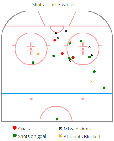 We noted that he has been much more willing to go to the net over these playoff games and it shows in the shot chart. Throughout the season, a lot of his shots came from outside of the faceoff circles, he was getting shots toward the net but he was not able to consistently beat goaltenders from distance.