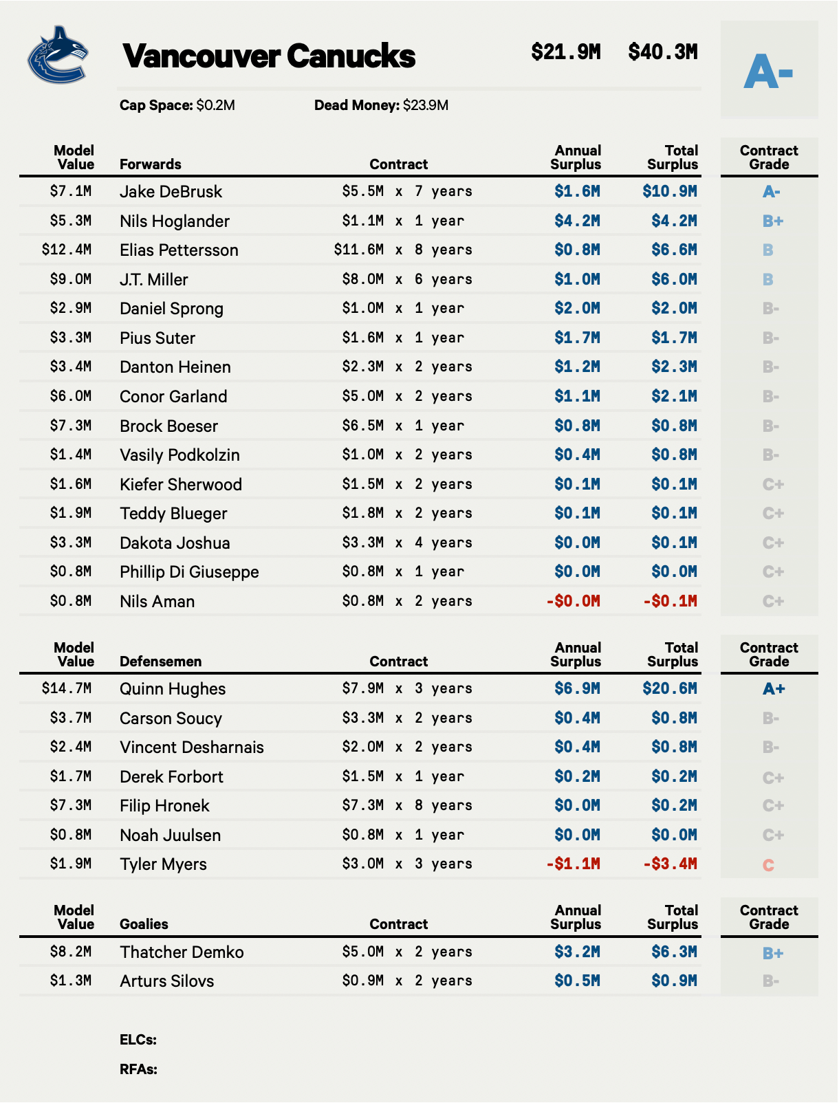 Even the extensions the club signed this offseason — which some were scoffed at — provide surplus value to the team: Elias Pettersson ($800k), Vasily Podkolzin ($400k), Teddy Blueger ($100k), with Filip Hronek and Dakota Joshua coming in at perfect model value.