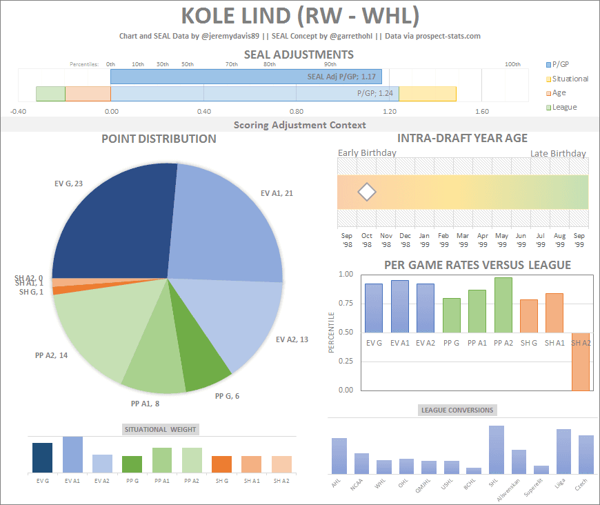 Lind stayed on the right side of the goals ledger this season, with the Rockets scoring a 64.4% share of the goals while Lind was on the ice. While the Rockets were a solid team in this regard to begin with, Lind still has a GF%rel of +10.6%. Lind also performs well in SEAL adjusted scoring, who gets a nice boost from his situational scoring despite a relatively early birthday for this draft.