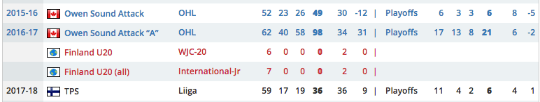 The gamble appears to have paid off in spades, with Palmu registering 17 goals and 36 points in 59 games for TPS Turku en route to winning the SM-Liiga rookie of the year title.