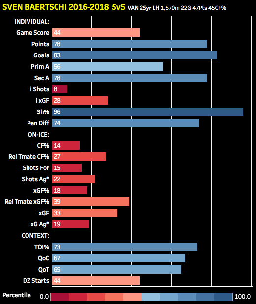 As I noted in a mid-season article for The Athletic Vancouver, though, the percentages at play suggested that these totals were a touch inflated due to on-ice variance beyond Baertschi’s control. Only further complicating matters was the fact that his team was routinely hemmed into the defensive zone according to the underlying metrics I rely on most frequently for my analysis.