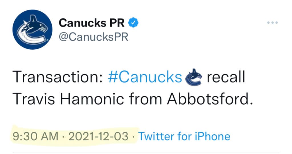 Hearing this could be a coach’s decision related to Hamonic having not played a ton of games recently. Team may not want to change up a lineup they’ve won two straight games with. #Canucks