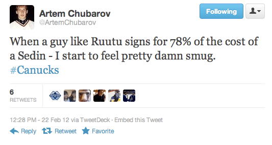 Why so smug, Drance? Did you sign him to the contract yourself? Have you ever even TALKED to a Sedin? Can you even tell them apart? I completely doubt it. Don’t feel smug over something a guy you don’t know did for two people you’ve never met, just because they play on your favorite team. I think all that time spent in Toronto is starting to rub off on you, son…