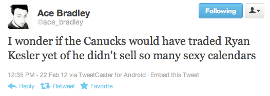 Wait, Ryan Kesler was on a calendar? I must have missed that part. He posed in that photo for a magazine, and I dunno, just spitballing here, but they MIGHT have resigned him for his ability to play at both ends of the rink, his character, his heart, his unbelievable play in both the playoffs and regular season last year, and the fact that he was willing to take less to play with Vancouver. But on second thought, no, you’re right. Calendars.
