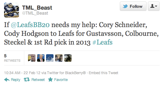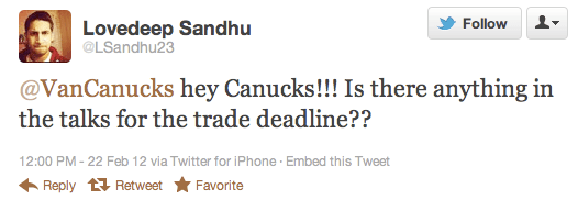Trade deadline news? You’ve come to the right place! The Vancouver Canucks Twitter account, run by a person hired by the team to take care of that so the people who make the real decisions don’t have to. But you keep pushing, my friend. It’s not like there are a ton of media outlets on Twitter you can get trade news from.