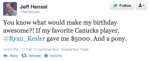 Ryan Kesler wishing you a happy birthday isn’t enough? You want him to bring you some of his money AND a pony? Somebody is a greedypants!