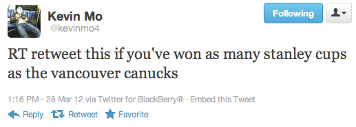The Canucks may not have any Cups, but at least they have a chance, Kevin Mo. Judging by your Twitter feed, the dream died for you a long, long, long time ago.
