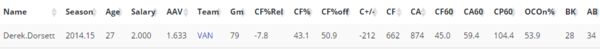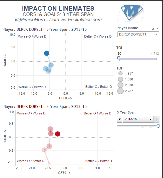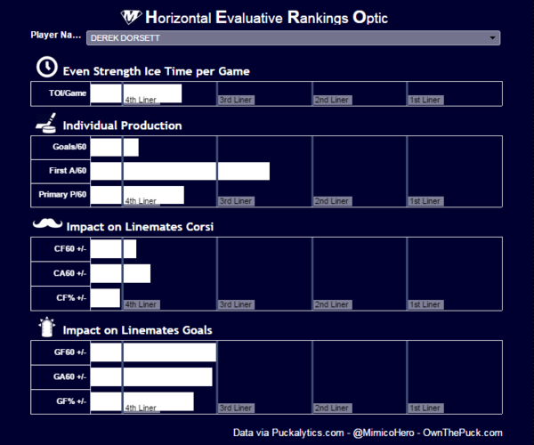 Scoring chances aren’t giving Dorsett a particularly good look. Vancouver bled chances, to the tune of nearly 28 SCA/60 with Dorsett on the ice. For a player who’s game is based on strong defensive play, that’s a little less than encouraging.