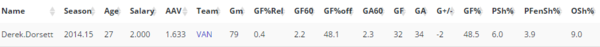 The underlying goal-based data shines a much more favourable light on Dorsett. With a Goals For of 48%, it’s hardly an ideal mark, but an improvement on his Corsi results all the same. By GF%Rel, the Canucks actually fared marginally better with Dorsett on the ice than off. Although, I’d caution against putting too much stock in this data, as Dorsett was clearly benefiting from an elevated on-ice sh%.