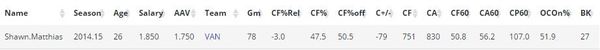 I was very surprised that only two Canucks forwards fared worse in Goals For% than Matthias. While Matthias has always been somewhat of a defensive disaster, I figured his offensive prowess would be enough to buoy himself to respectability in this category. In all likelihood, this number is reflective of Matthias’ lackluster ability to facilitate offense from any stick other than his own.