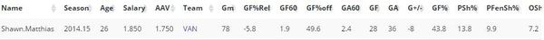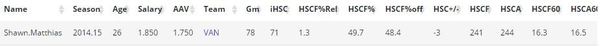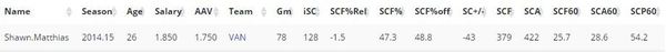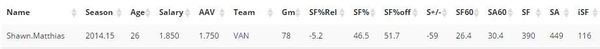It should come as no surprise that Matthias set a career high in iSC this season with a whopping 134, 10 more than his previous career high set in 2011-12. Similarly, it shouldn’t be overly enlighting to find out that the Canucks fared much better without Matthias on the ice in this regard as well.