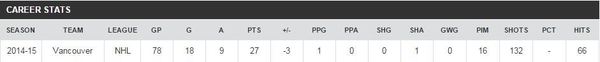 The 14-15 campaign was ripe with personal bests for Matthias. New career highs were set in goals (18), assists (nine) and points (27). On a completely related note, Matthias also set a career high in Sh% this season hitting the 14.3% mark at evens; by that same token, he didn’t necessarily experience a spike in on-ice Sh%, as evidenced by the low assist numbers.