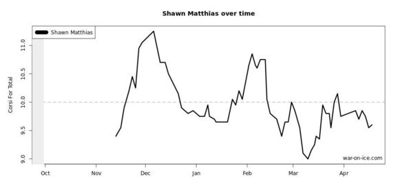 Interestingly enough, Matthias took a significant step backwards last season in shot volume – more than two less shots per 60 minutes. While less significant, Matthias’ shot suppression also took a step in the wrong direction.