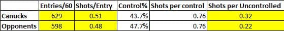 For the most part, Vancouver has been a pretty strong team at even strength early on in the year. They are a top 10 team in terms of Shot, Corsi & Fenwick percentage and have outscored their opponents by two. However, their performance in the neutral zone could use some improvement going by these numbers. Vancouver had the better hand of zone entries, but they’ve only gained the line with control of the puck 43.7% of the time.