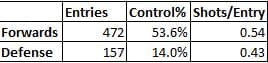 There isn’t a lot to take in with these numbers because the Canucks defensemen don’t have a lot of zone entries and most of them dump the puck every chance they get. Kevin Bieksa is really the only defenseman who has been joining the rush when the puck is on his stick and even he has had control on less than 30% of his five-on-five entries. Andrew Alberts also has a high control rate, but it doesn’t mean much because he has only three total entries on the season.