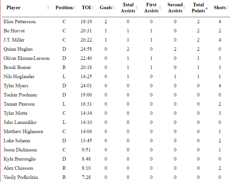 The Miller, Boeser and Tanner Pearson line had another great shift where they generated more shots and a scoring chance later in the period. The trio was giving momentum to the team but aside from the Podkolzin line, none of the other lines were able to maintain extended offensive possessions in the period.