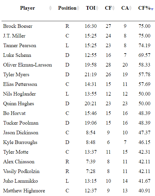 The J.T. Miller line had a great shift with about 12 minutes remaining in the period. Miller drove the net hard and created a mad scramble that led to a pair of scoring chances for Brock Boeser.