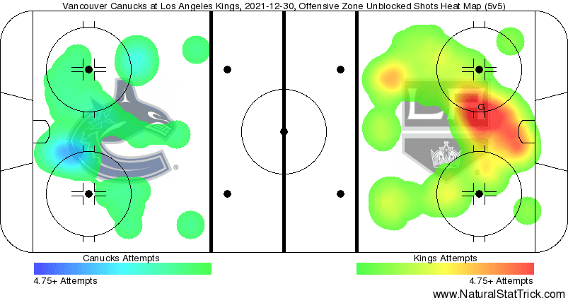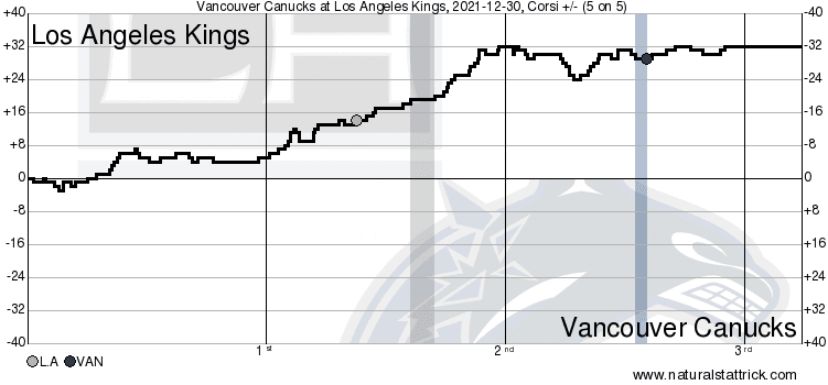 You have to feel for Jaroslav Halak who has received one goal of offensive support in four of his eight starts this season. The Canucks were able to scrape out a point with a strong third period but could not overcome the dominance that they faced in the second period. The Kings attempted 36 shots in the middle frame compared to the Canucks, who only had six shot attempts in the period.