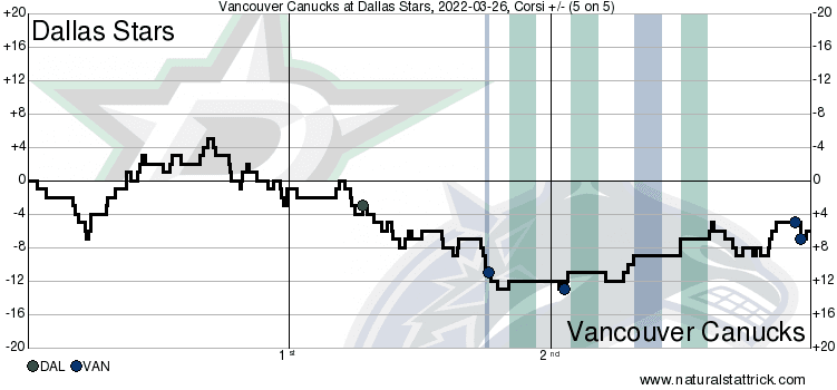 This was an uber-important game. With a win in regulation, the Canucks’ playoff chances rose to 17%. With a loss against Dallas, who they’re trailing in the standings, their odds would have dropped to 6%.