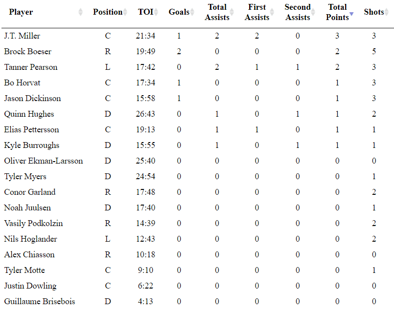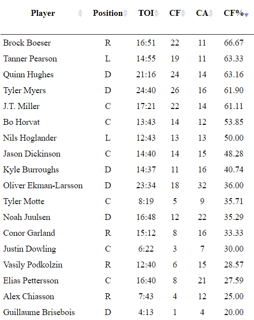 Brock Boeser was excellent and his confidence continues to grow. He scored two goals, played 19:49, had 10 shot attempts and dominated possession with a team-high 66.67% Corsi. He and his whole line were creating turnovers and putting together good passes to generate scoring chances. Throughout the entire game, their line was excellent and you can see how confidence is key with this group.