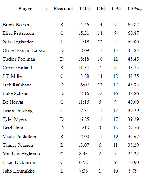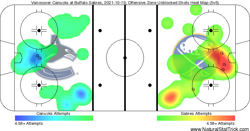 The Canucks were bad in this game. They were outplayed by a much worse Sabres team and struggled to play defence against them. The Canucks were out-chanced at five-on-five by a count of 22-13. The glaring problem was their ability to defend near their own net but there were underlying problems in the offensive zone that held the Canucks back as they were unable to capitalize on many chances.