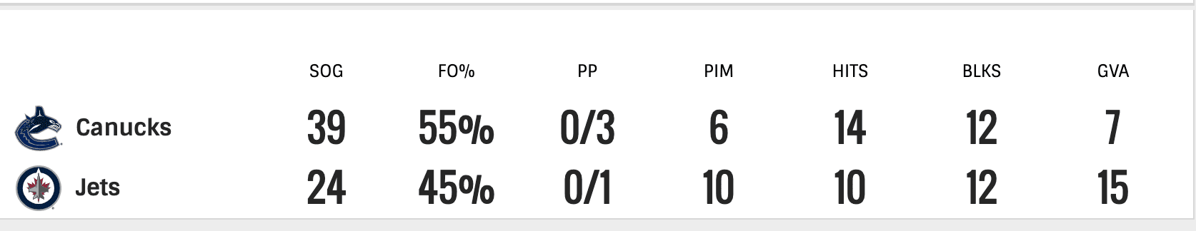 What more can you ask for? The Canucks played a great all-round game and dominated in all facets. The score would have been much more lopsided if it were not for the great goaltending of Hellebuyck and it got the road trip started off on the right note.
