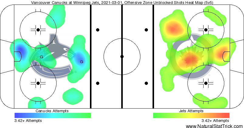 Heatmap from Canucks vs Jets March 1, 2021 (courtesy of naturalstattrick.com)