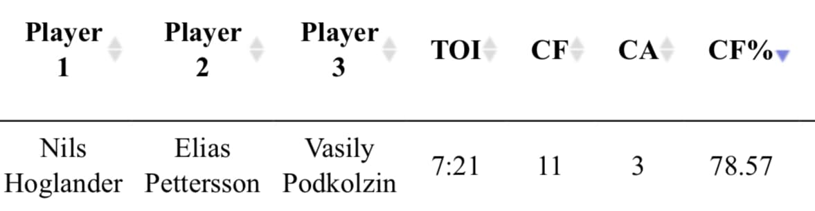 The biggest takeaway from the second period was the dominance of the Podkolzin-Pettersson-Höglander line. They spent a big part of their ice time in the offensive zone as they passed the puck well. Each player on the line showed that they had the stick-handling and skating ability to gain the zone on their own.