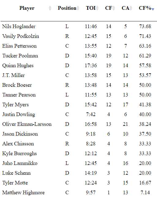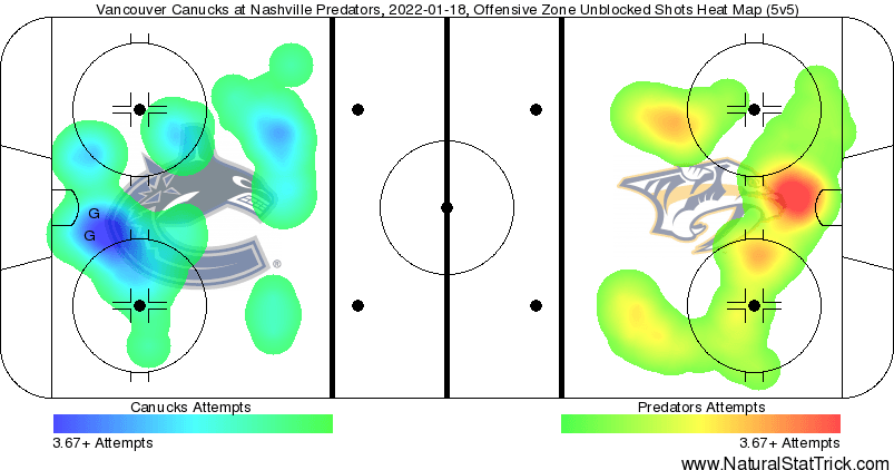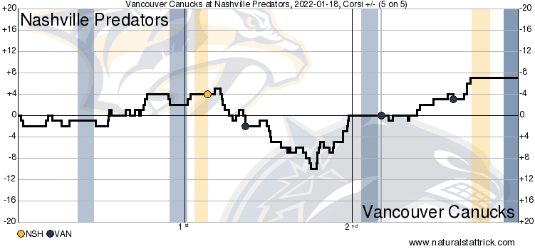 Throw another top performer medal in Thatcher Demko’s trophy case. He faced 32 shots and stopped 31 of them. On top of those 32 shots, Demko saw 25 scoring chances and was excellent. He didn’t make many five-alarm saves but he was just solid all throughout the game. He was rarely out of position and big when the Preds were in tight with chances.
