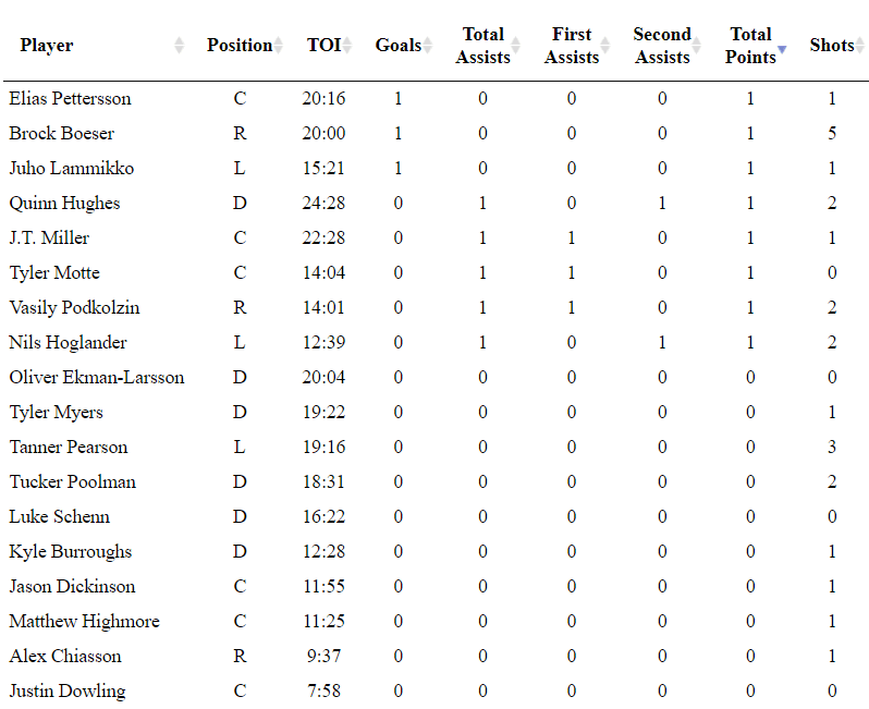 Pettersson was favouring his left hand after taking a cross-check to the wrist. He seemed to shake it off as time ticked away in the period.