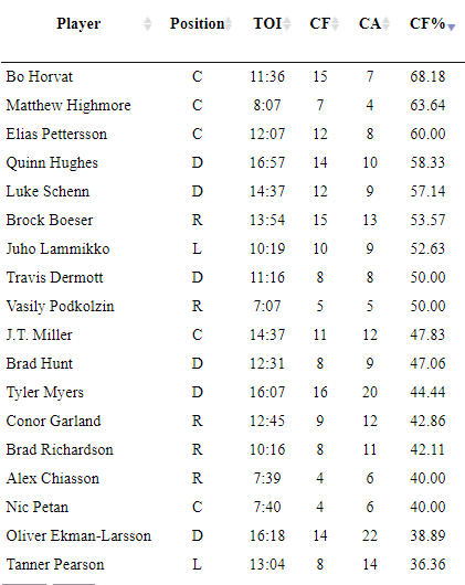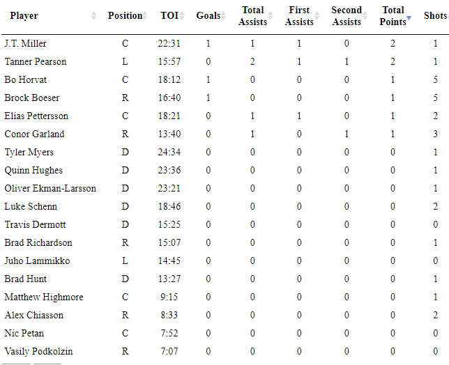 We wanted to keep a close eye on Travis Dermott in his Canucks debut. He made all of the plays that presented themselves and did move around the ice with some fluidity. He was the low man on the defence core for ice time in the first period with 4:05 but moved the puck well and was not caught in his own zone.