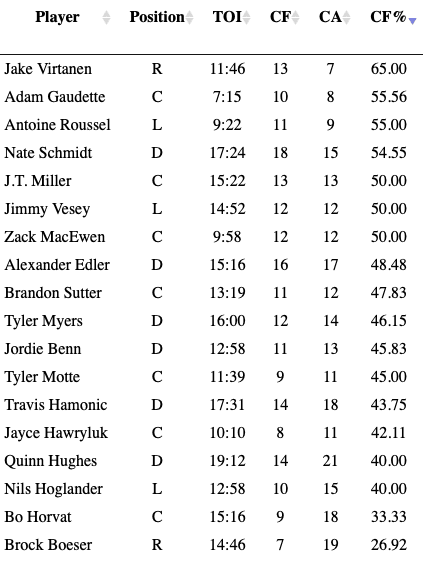 This was Thatcher Demko’s eighth consecutive start, and he’s literally been saving the Canucks’ butts for all of them. Here’s hoping some players show up for their outstanding goalie.