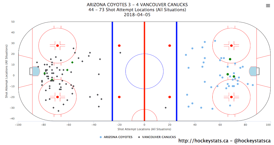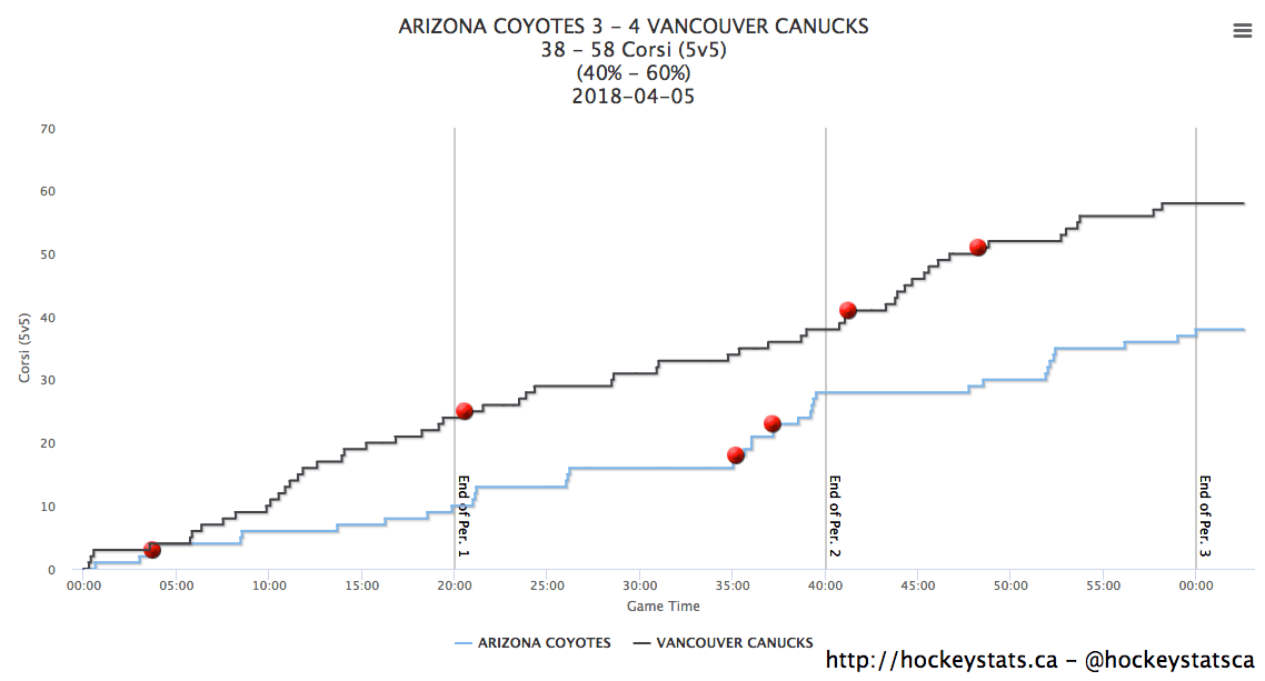 If not for that rush, though, it’s hard to imagine the Coyotes finding the back of the net in the first. It was all Canucks. By the end of the first frame, Vancouver had 24 shot attempts at 5-on-5 to Arizona’s 10.