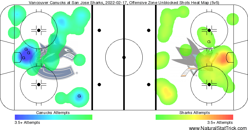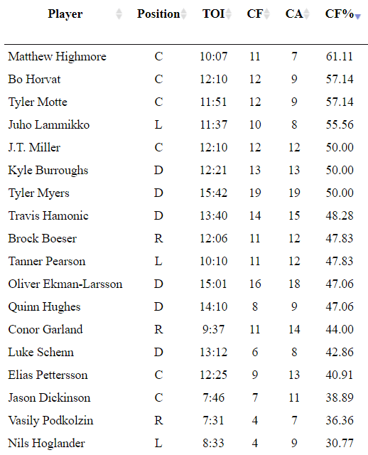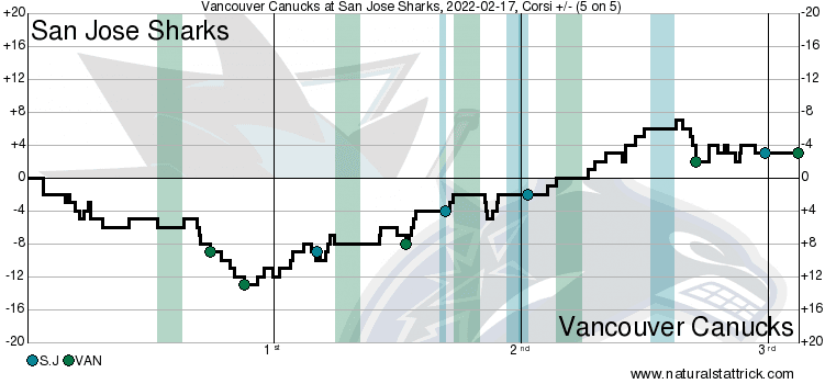 It was one of the Canucksā best first periods of the season. They outshot the Sharks by a count of 15-4 and spent a large majority of their time in the Sharksā zone. The Miller-Horvat-Boeser line was excellent together and created scoring chances on almost all of their shifts while not allowing a shot against in their 3:36 together at five-on-five in the period.