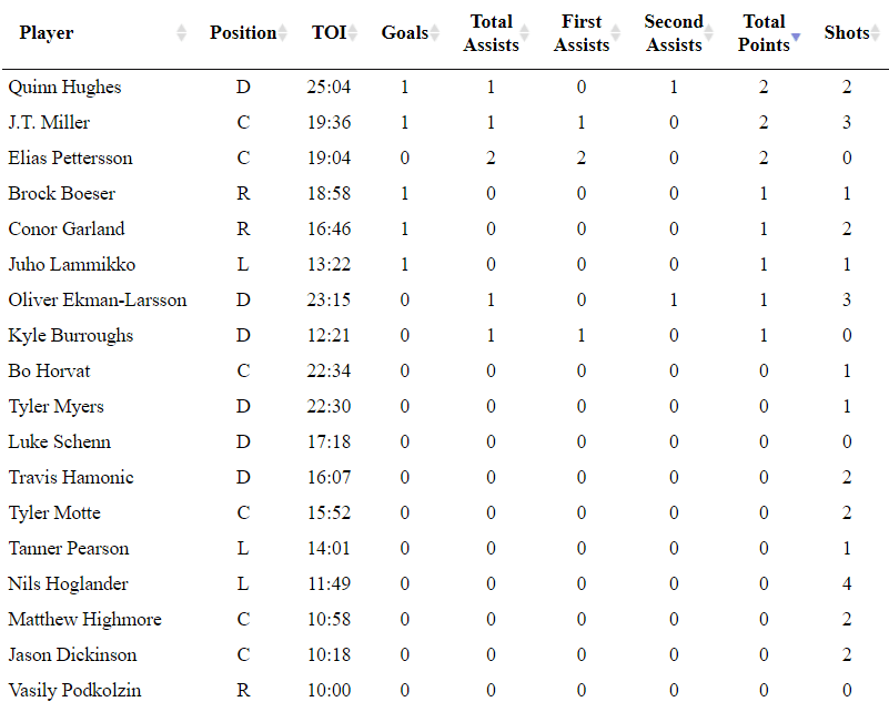 Quinn Hughes made a big impact in his return to the lineup. Hughes played 25:04 and had two points in his return to the lineup. There wasnāt really one Canucks who stuck out as the top performer but I missed watching Hughes skate so this top performer goes to him.
